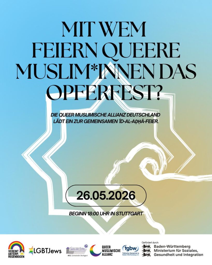 Bei gutem Essen und in einem offenen, wertschätzenden Austausch kommen wir als Muslim*innen und nicht-Muslim*innen zusammen und sprechen darüber, was Īd al-Adhā bedeutet: Opferbereitschaft, Verantwortung, Solidarität und Fürsorge. Wie leben und interpretieren wird diese Werte als queere Muslim*innen und nicht-Muslim*innen heute? Denn dieses fest erinnert uns auch daran: Niemand sollte an einem Feiertag alleine sein.